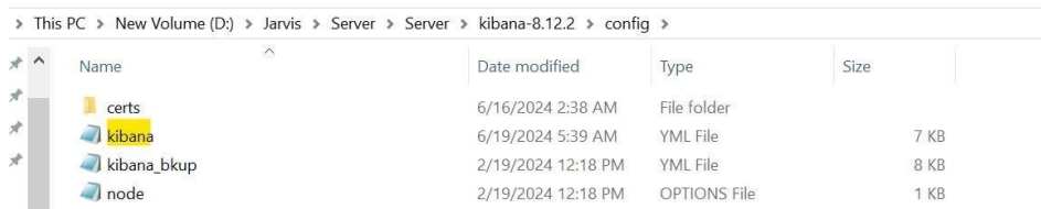 1. In the server folder, you will have Kibana 8.12.2 folder. Open it and go to the config folder. Inside it you will have Kibana.yml file as shown below. Open it with Notepad.